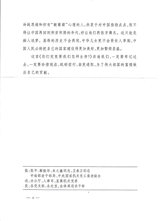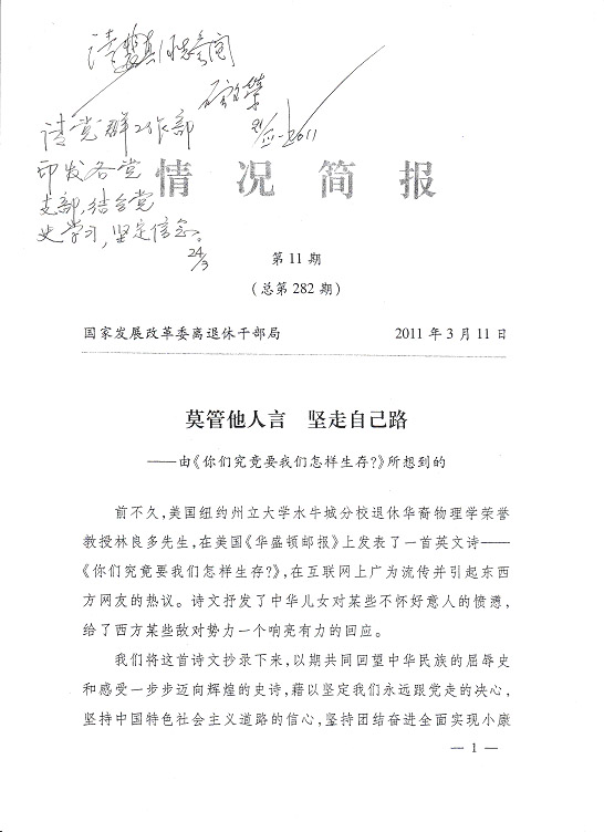 編者按:國家發改委離退休干部局《情況簡報》今年第11期刊載《莫管他人言堅走自己路­——由〈你們究竟要我們怎樣生存?〉所想到的》,是一篇洋溢著愛國主義情懷的好詩文,現根據公司領導的指示予以轉載,請各支部作為黨史學習的生動教材,激發全體同志堅定永遠跟著黨走的決心,堅持走中國特色社會主義道路,為全面實現小康社會而努力奮斗。