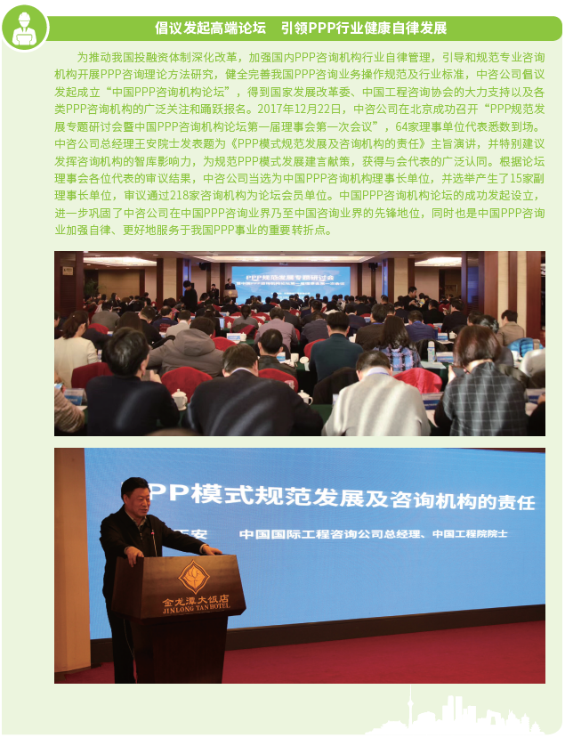 2016年以來,中咨公司緊緊圍繞“12445”發展戰略構想,鞏固提升五大業務支撐體系,積極探索開展政府和社會資本合作(以下簡稱PPP)咨詢等投資策劃業務,建立投融資平臺,尋找有價值的投資機會,實現資本與智本的融合,構建智力服務新業態,拓寬工程咨詢服務價值鏈。