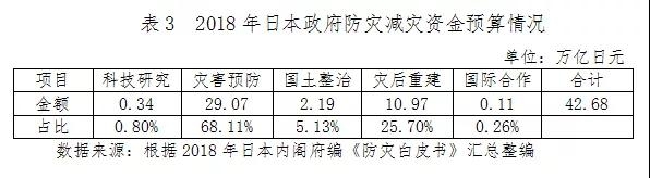圖1 日本《災害對策基本法》概要 依據《災害對策基本法》,日本從中央到地方建立了完善的災害應對體系,如圖1所示。中央政府在內閣府設置中央防災會議,組織制訂《防災基本規劃》并積極推行防災基本規劃的實施,并負責協調有關防災方面的各中央政府部門之間、中央與地方以及地方公共機關之間的關系,協助地方政府和各行政機關制訂并實施相關的地區防災規劃。《防災基本規劃》是防災領域最高層次的規劃,其中按照災害種類分別規劃,如針對地震的防災減災制訂了大規模地震防災減災對策、城市直下型地震對策、東海地震對策、南海地震對策、近海地震對策等。 正是由于有了一套完善且行之有效的災害管理體系和制度,整個日本在發生重大自然災害時,從政府到民間的各項搶險、救災及災后重建工作都井然有序,災民情緒也比較穩定。 三 風險分散、責任共擔的資金保障體系 日本的防災減災及災后重建的資金保障體系成熟完整,包括財政、金融、保險和民間捐贈等方面的資金來源。 一是財政資金渠道和責任清晰明確。日本實行地方自治,因此在防災救災體系中無論是行動責任還是資金責任都首先由地方政府承擔,中央政府進行各種形式的支持和援助。日本在防災減災領域的政府資金投入分為科技研究、災害預防、國土整治、災后恢復重建、國際防災合作五個類別。這些資金投入責任分散在政府的各有關部門,如科技研究主要在文部科學省,國土整治主要在國土交通省。日本2018年的防災減災政府投入資金預算約42.68萬億日元,如表3所示。 地方政府層面則建有復興基金,每年按照前三年地方普通稅收額平均值的5‰作為災害救助基金進行累積,地方政府的財政盈余、投資或貸款的收益、個人捐款等均作為資本金進入。如果發生巨大災害導致災后重建資金需求超出防災預算,受災當地政府可以發行專門的災后重建債券,中央政府也會向地方政府提供各類長期的重建貸款。 二是較為完備的政策性金融支持,主要體現在支持住房重建和產業重建兩個方面。日本設有《受災者生活再建支援法》,對于在災害中受損的住房修復與重建,由中央政府和地方政府按1:1的比例分攤進行資金補助,最高可提供300萬日元。此外,還設有災害援助資金貸款、生活福祉資金貸款、母子寡婦資金貸款等賑助貸款,對符合條件的家庭給予一定數額的10年無息貸款,幫助受災家庭恢復生活。產業重建方面包括對農林漁業恢復經營提供的貸款支持和對中小企業恢復生產提供的貸款支持,利率低于市場利率且期限較長。 三是政府與市場合作、多主體風險共擔的保險體系。日本設有《地震保險法》,地震保險采用政府與商業保險公司合作的方式建立。住宅所有人向各財產保險公司購買地震保險,各財產保險公司再就所承保的地震保險業務,全額向日本再保險株式會社再保;而日本再保險株式會社在扣除政府應負擔的額度和自留額后,將剩余部分全額轉再保于各財產保險公司,二者之間形成復雜的再保與轉再保關系。當地震保險超過日本再保險株式會社的保險責任時,會社會與政府簽訂地震保險超額的轉再保合同,由日本國會承諾在一定的責任限額內由政府擔保。從上述保險體系可以看出,政府財政支持在地震保險體系中至關重要。地震一旦發生,保險主體各自按其責任范圍進行賠付,在多方分擔的前提下彌補損失,助力受災地區盡快恢復生活和社會秩序。 四是民間組織的廣泛參與。日本社會存在大量活躍在防災減災和災后重建各個階段工作的非政府組織,他們的主要工作包括日常運作和災害發生后的專項募集,具有靈活多樣的優點。災難發生后,非政府組織可以分擔不能通過政府統一政策得到充分滿足的各類特殊需要,減輕政府責任。政府主要通過稅收減免和政府購買服務的方式對這些非政府組織進行財政支持。 四 深入人心的防災減災宣傳普及活動 日本政府開展的防災減災宣傳普及活動十分成功,有許多制度化而又豐富多彩的形式。 一是設有眾多的防災減災主題宣傳日。例如,日本規定每年的9月1日為“防災日” , 8月30 日到9月5日為“防災周”,在此期間會采取展覽、媒體宣傳、標語、講演會、模擬演習、避難訓練等各種形式舉辦宣傳普及活動。 圖2 日本2018年海嘯日宣傳畫 二是在中小學開展系統實用的防災減災教育。1995年阪神大地震發生以后,日本對學校開展防災教育更加重視,政府部門組織編寫防災教材分發給學校,號召各地中小學都要開展防災教育。 圖3 保護自己訓練 (鹿兒島縣志布志市) 三是鼓勵居民形成自主防災救災共救組織。阪神大地震后,日本開始提倡“自救” “公救” “共救”的原則,即災害發生后首先是居民的“自救”、然后是鄰里和社區的“共救” 、最后是政府的“公救”。目前大部分町村級行政區劃中設有居民自主防災組織,日常會開展防災訓練、防災知識普及、防災巡邏等活動,發生災害時主要負責初期消防 、引導居民進行避難 、救助傷員 、搜集和傳遞信息 、分發食物和飲用水等。 四是開展多樣化的防災訓練。日本各地每年都會根據當地的具體情況(多發災種)開展多種形式的防災訓練,政府層面也會給予鼓勵和支持。例如,2017年9月1日,日本首相安倍晉三及全體內閣成員都參加了緊急災害對策總部舉辦的城市直下型地震防災演習