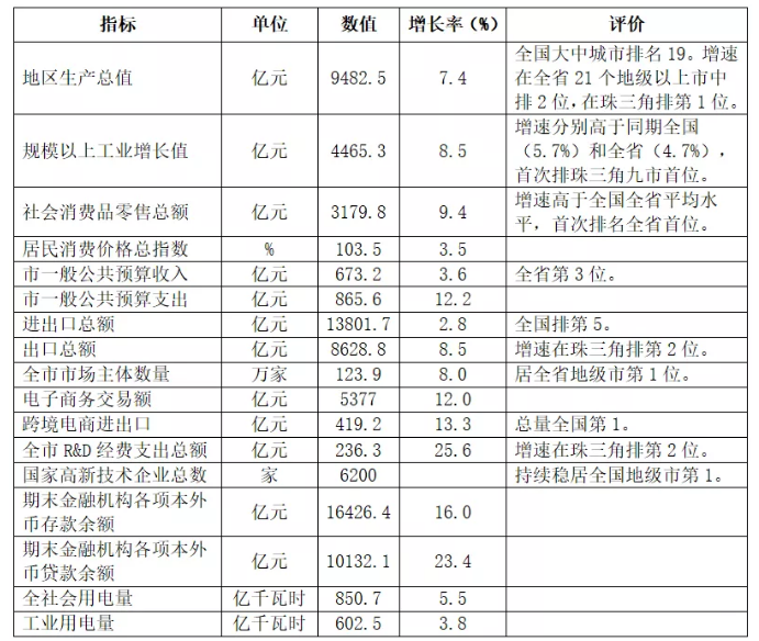 表1 東莞市2019年主要經濟指標