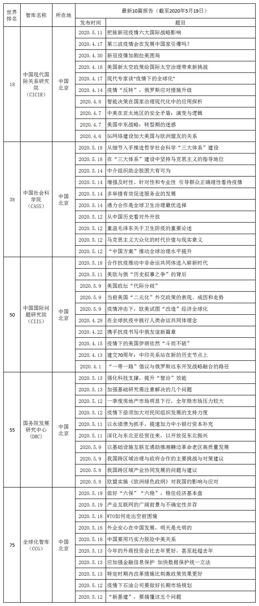 表3 中國排名前五智庫2020年4月至5月的最新研究成果