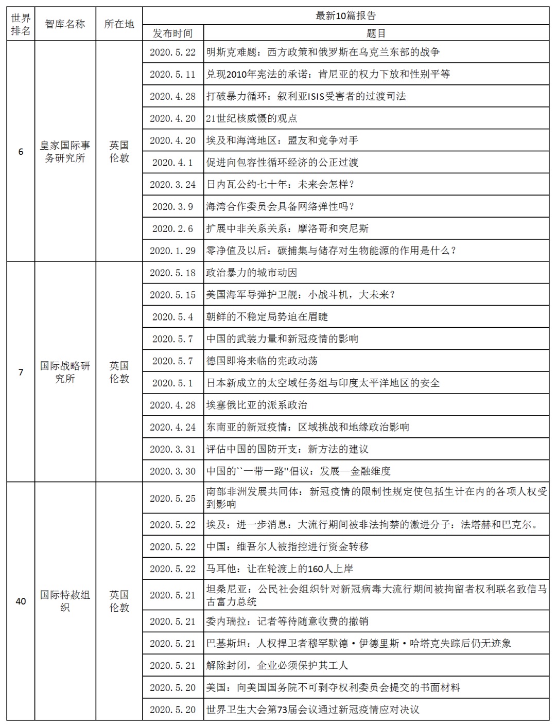 表4 英國排名前三智庫2020年1月至5月的最新研究成果(截至2020年5月25日)