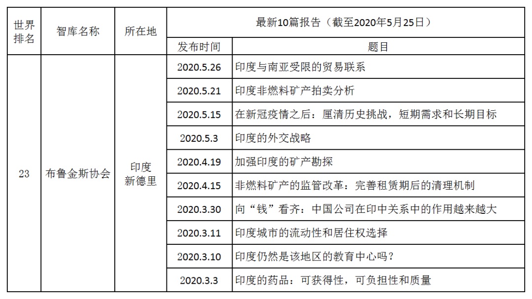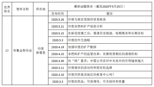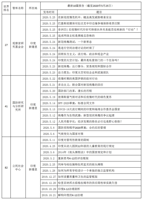 表5 印度排名前三智庫2019年10月至2020年5月的最新研究成果