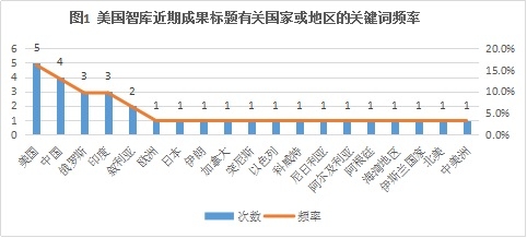 從成果涉及的關鍵詞看,5家智庫近期文章主要關注COVID-19(新冠病毒)、中美關系、我國習近平總書記提出的戰略和政策、美國特朗普政府政策等;標題里直接出現的具體國家和地區包括美國(華盛頓)(5次)、中國(北京、臺灣)(4次)、俄羅斯(3次)、印度(3次)、敘利亞(2次)等19個國家和地區,見圖1。