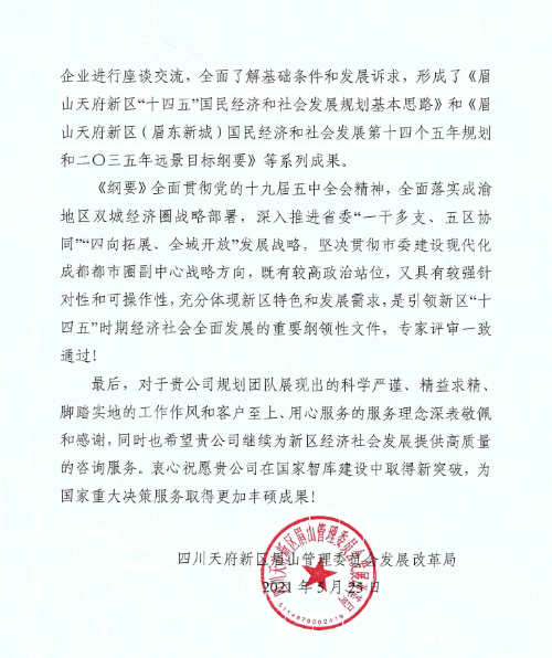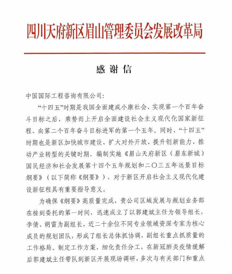 近日,中咨公司收到天府新區(qū)眉山管委會(huì)發(fā)展改革局寄來的熱情洋溢的感謝信,感謝中咨公司長期以來的關(guān)心和支持,特別感謝區(qū)域發(fā)展與規(guī)劃業(yè)務(wù)部審時(shí)度勢(shì)、創(chuàng)新思維、高質(zhì)量完成當(dāng)?shù)亍笆奈濉币?guī)劃綱要編制工作。