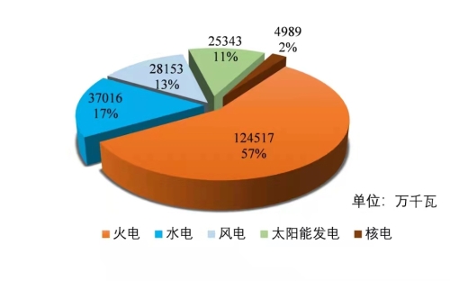 一、電力系統發展現狀 目前,我國電網已形成以華北、華中、華東、東北、西北、南方等區域電網為主體,區域電網間交直流互聯,覆蓋全部省(區、市)的大型電網。截至2020年底,全國220千伏及以上輸電線路長度78.98萬千米,同比增長4.6%;220千伏及以上變電設備容量448680萬千伏安,同比增長為5.2%。全國電網發電裝機22億千瓦,同比增長9.5%,其中火電12.45億千瓦、水電3.7億千瓦、核電0.50億千瓦、風電2.82億千瓦、太陽能發電2.53億千瓦(見圖1)。我國電網規模和發電裝機規模均居世界首位。2020年全社會用電量75110億千瓦時,同比增長3.1%,“十三五”年均增速5.7%。