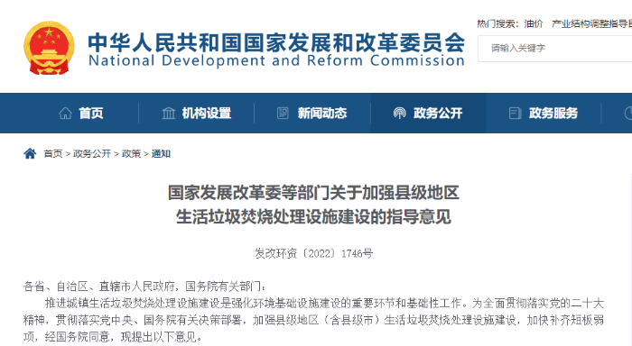 因地制宜 分類施策 有力有序補齊縣級地區生活垃圾焚燒處理設施短板 ——《關于加強縣級地區生活垃圾焚燒處理設施建設的指導意見》解讀 中國國際工程咨詢有限公司 張英健 楊媛媛 徐春方 推進城鎮生活垃圾焚燒處理設施建設是強化環境基礎設施建設的重要環節和基礎性工作,是改善人居環境的重要內容。黨中央、國務院高度重視城鎮環境基礎設施,黨的二十大報告明確提出要“提升環境基礎設施建設水平”。近日,經國務院同意,國家發展改革委、住房和城鄉建設部、生態環境部、財政部、人民銀行等部門聯合印發《關于加強縣級地區生活垃圾焚燒處理設施建設的指導意見》(發改環資〔2022〕1746號,以下簡稱《指導意見》),全面系統提出加強縣級地區生活垃圾焚燒處理設施建設的指導思想、工作原則、主要目標、重點任務,指導各地有力有序推進焚燒處理設施建設。《指導意見》作為首個聚焦縣級地區生活垃圾處理的政策文件,是貫徹落實黨的二十大精神的重要舉措,對加快補齊縣級地區生活垃圾焚燒處理短板、提升生活垃圾治理水平、改善人居環境具有重要意義。 01 充分認識加強縣級地區生活垃圾焚燒處理設施建設的重要意義 (一)加強縣級地區生活垃圾焚燒處理設施建設是推進以縣城為重要載體的城鎮化建設的重要途徑。縣級地區(含縣級市)是我國城鎮體系的重要組成部分。截至2021年底,我國縣及縣級市數量超過1860個,約為全國縣級行政區劃數量的65%、地級及以上城市市轄區數量的2倍;城區人口約2.5億人,約占全國城鎮常住人口的30%。生活垃圾分類和處理是城鎮化建設的重要內容,今年5月,中共中央辦公廳、國務院辦公廳印發《關于推進以縣城為重要載體的城鎮化建設的意見》,明確提出要建設與清運量相適應的垃圾焚燒設施。加強焚燒處理設施建設,加快完善縣級地區環境基礎設施,對促進新型城鎮化建設具有重要意義。 (二)加強縣級地區生活垃圾焚燒處理設施建設是提升環境基礎設施建設水平的重要內容。環境基礎設施是基礎設施的重要組成部分,是深入打好污染防治攻堅戰、改善生態環境質量、增進民生福祉的基礎保障。黨的二十大報告對提升環境基礎設施建設水平作出明確要求,今年1月,國務院辦公廳轉發國家發展改革委等部門《關于加快推進城鎮環境基礎設施建設的指導意見》對城鎮環境基礎設施建設作出系統部署。生活垃圾焚燒處理設施是環境基礎設施的重要組成部分,加快縣級地區生活垃圾焚燒處理設施建設,為構建系統完備、高效實用的環境基礎設施體系提供有力支撐。 (三)加強縣級地區生活垃圾焚燒處理設施建設是推進城鄉人居環境整治的重要方式。環境基礎設施水平影響縣級地區人居環境和整體面貌,是縣級地區生態文明建設的重要支撐。近年來,我國生活垃圾焚燒處理方式快速發展,城市生活垃圾焚燒處理率明顯上升,但大量縣級地區生活垃圾清運量小,不具備建設規模化垃圾焚燒處理設施的條件,生活垃圾處理以填埋為主,存在較大安全環境隱患。加強生活垃圾焚燒處理設施建設,加快發展以焚燒為主的生活垃圾處理方式,是滿足群眾對優美生態環境需要的重要舉措,是改善人居環境、保障人民健康的重要途徑。 02 因地制宜提出縣級地區生活垃圾焚燒處理設施建設的主要目標 我國縣級地區數量大、類型多,經濟社會發展水平、人口資源分布、飲食習慣、生活垃圾組分等各不相同,《指導意見》充分考慮縣級地區資源環境承載能力、區位條件、生活垃圾焚燒處理設施建設工作基礎,分四類地區因地制宜提出了“到2025年,全國縣級地區基本形成與經濟社會發展相適應的生活垃圾分類和處理體系,京津冀及周邊、長三角、粵港澳大灣區、國家生態文明試驗區具備條件的縣級地區基本實現生活垃圾焚燒處理能力全覆蓋。長江經濟帶、黃河流域、生活垃圾分類重點城市、‘無廢城市’建設地區以及其他地區具備條件的縣級地區,應建盡建生活垃圾焚燒處理設施。不具備建設焚燒處理設施條件的縣級地區,通過填埋等手段實現生活垃圾無害化處理”的目標,并提出了“到2030年,全國縣級地區生活垃圾分類和處理設施供給能力和水平進一步提升,小型生活垃圾焚燒處理設施技術、商業模式進一步成熟,除少數不具備條件的特殊區域外,全國縣級地區生活垃圾焚燒處理能力基本滿足處理需求”的目標。 03 準確把握加強縣級地區生活垃圾焚燒處理設施建設的重點任務 《指導意見》堅持因地制宜、分類施策,按照“宜燒則燒,宜埋則埋”的原則,聚焦縣級地區生活垃圾焚燒處理能力短板,堅持問題導向、目標導向,從設施布局、回收轉運體系建設、焚燒能力建設、小型焚燒試點、設施運營監管、提升可持續運營能力等方面部署了19項重點任務,為推進縣級地區生活垃圾焚燒處理設施建設提供了行動指引。 (一)堅持規劃引領,有序開展設施規劃布局。《指導意見》明確各地要結合縣級地區生活垃圾焚燒處理設施項目建設需求,及時開展生活垃圾處理設施建設相關規劃編制或修訂工作。以市為單位系統謀劃轄區內縣級地區生活垃圾焚燒處理設施建設,新建設施要在開展現狀評估的基礎上,科學規劃設施布局,合理確定設施規模。 (二)堅持因地制宜,科學合理推進設施建設。《指導意見》提出要綜合考慮項目所在地區經