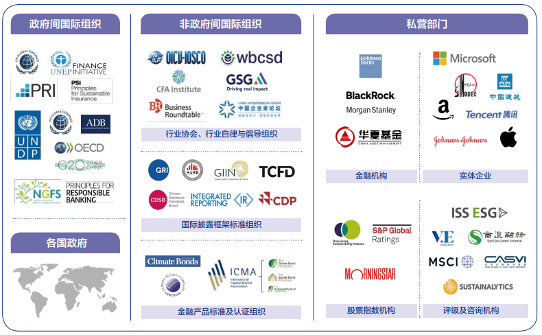ESG理念和投資原則的迅速傳播和應(yīng)用,關(guān)鍵在于政府間國際組織、非政府間國際組織、公共部門和企業(yè)等多元主體共同參與。聯(lián)合國系統(tǒng)的13家機(jī)構(gòu)或倡議組織(包括UNCTAD、ITC、UNDP、UNEP、WBG、IFC、IMF、UN SSE、UNEP FI、PRI、PSI、PRB、UNGC 等),經(jīng)濟(jì)合作與發(fā)展組織(OECD)、二十國集團(tuán)(G20)等重要的國際多邊合作組織,都積極推動(dòng)ESG政策的制定實(shí)行,以亞洲開發(fā)銀行(ADB)為代表的各地區(qū)開發(fā)銀行也紛紛加強(qiáng)對(duì)可持續(xù)領(lǐng)域的項(xiàng)目投資力度,推動(dòng)地區(qū)可持續(xù)發(fā)展目標(biāo)的實(shí)現(xiàn)。在各類國際組織、政府監(jiān)管部門、金融機(jī)構(gòu)和實(shí)體企業(yè)等共同推動(dòng)下,ESG逐漸走向標(biāo)準(zhǔn)化、國際化、體系化、全面化,成為了國際資本市場的一種“新規(guī)則”。