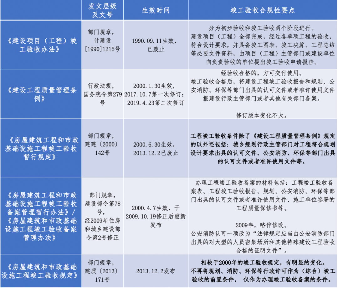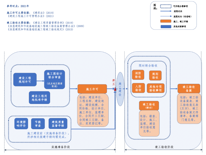 編者按 新中國成立以來,我國基礎設施投資建設取得了舉世矚目的成就,是國家經濟社會發展的重要支撐,為人民生活水平的提高做出了巨大貢獻。改革開放以來,市場開始發揮配置資源的決定性作用,為我國基礎設施的發展煥發了新的活力。據統計,我國基礎設施資產總規模在1990年排在全世界約第15位,2000年上升到第7位,2010年躍升為第3位,至2018年已居世界首位。 黨的二十大報告在回顧過去五年的工作和新時代十年的偉大變革中,充分肯定了基礎設施在經濟社會中發揮的重要作用。報告指出,我國“建成世界最大的高速鐵路網、高速公路網,機場港口、水利、能源、信息等基礎設施建設取得重大成就”。我國基礎設施多年來大規模的投資建設和存量資產的高速積累,是黨中央、國務院在建立社會主義市場經濟體制背景下,關于投融資體制改革部署的重要成果。 項目前期工作手續的合規性要求,是基礎設施能夠發揮其應有價值的重要前提,也是投融資體制改革關注的重點內容之一。伴隨著政府職能轉變、深化“放管服”改革和擴大有效投資等重大決策的關鍵部署,我國工程建設項目審批制度不斷優化和改革,基礎設施項目投資前期決策管理經歷了復雜的演變進程,其合規性標準也在與時俱進、不斷完善。當前我國已進入基礎設施存量時代,存量資產項目前期工作手續的合規性是重要的盤活條件之一,部分合規性問題已成為新時代社會廣泛關注的焦點。本項專題研究立足投融資體制和項目審批制度變革的歷史背景,嘗試厘清基礎設施項目在立項、土地、規劃、環境、建設施工等方面主要前期工作的歷史變革脈絡,梳理不同管理事項之間的邏輯關聯,從這一視角提供基礎設施項目前期工作手續的合規性認識。本公眾號將研究報告的部分成果以系列文章的形式陸續刊發,研究報告第一部分為背景與立項篇,第二部分為土地與規劃篇,本文是系列研究報告的第三部分(建設施工篇),供業界同仁參考。 基礎設施項目前期工作手續合規性研究(Ⅲ) 張雪飛 伍迪 摘要:開工和竣工是基礎設施項目建設施工方面的重要工作節點,依法合規開展有關工作是項目的合規性前提。建筑工程施工許可證(或開工報告)是建筑施工單位符合施工條件、允許開工的批準文件,是建設單位進行工程施工的法律憑證,是工程項目由實施準備轉向施工建設、由藍圖設計變成項目實體的重要工作手續。竣工驗收是建設工程項目竣工后,全面考核建設工作、檢查是否符合設計要求和工程質量的重要環節,是工程項目由施工建設走向運營投產,是建設投資成果轉入交付使用的關鍵工作事項。本文聚焦基礎設施項目建設施工方面的手續,尤其對施工許可和竣工驗收兩方面的主要內容和制度演進進行系統梳理,供業界參考。 關鍵詞:基礎設施;合規性;施工許可;竣工驗收;政策演進 一、施工許可手續合規性 (一)內涵與適用范圍 建筑工程施工許可證是建筑施工單位符合施工條件、允許開工的批準文件,是建設單位進行工程施工的法律憑證。根據有關法律政策規定,在中華人民共和國境內從事各類房屋建筑及其附屬設施的建造、裝修裝飾和與其配套的線路、管道、設備的安裝,以及城鎮市政基礎設施工程的施工,建設單位在開工前應當向工程所在地縣級以上人民政府建設行政主管部門申請領取施工許可證,國務院建設行政主管部門確定的限額以下的小型工程除外。具體而言,對于工程投資額在30萬元以下或者建筑面積在300平方米以下的建筑工程,可以不申請辦理施工許可證。各省、自治區、直轄市人民政府住房城鄉建設主管部門可以根據當地的實際情況,對限額進行調整,并報國務院住房城鄉建設主管部門備案。按照國務院規定的權限和程序批準開工報告的建筑工程,不再領取施工許可證。 辦理施工許可證有關事項應主要以《中華人民共和國建筑法》(以下簡稱《建筑法》)和《建筑工程施工許可管理辦法》等法規政策為依據。根據最新修訂且現行有效的2019年版《建筑法》和2021年版《建筑工程施工許可管理辦法》,申請領取施工許可證,應當符合的條件包括:(1)依法應當辦理用地批準手續的,已經辦理該建筑工程用地批準手續;(2)依法應當辦理建設工程規劃許可證的,已經取得建設工程規劃許可證;(3)施工場地已經基本具備施工條件,需要征收房屋的,其拆遷進度符合施工要求;(4)已經確定建筑施工企業;(5)有滿足施工需要的資金安排、施工圖紙及技術資料,其中施工圖設計文件已按規定審查合格;(6)有保證工程質量和安全的具體措施。 施工許可證的時效方面,根據有關規定,建設單位應當自領取施工許可證之日起3個月內開工。因故不能按期開工的,應當向發證機關申請延期;延期以兩次為限,每次不超過3個月。既不開工又不申請延期或者超過延期時限的,施工許可證自行廢止。在建的建筑工程因故中止施工的,建設單位應當自中止施工之日起1個月內,向發證機關報告,并按照規定做好建筑工程的維護管理工作。建筑工程恢復施工時,應當向發證機關報告;中止施工滿1年的工程恢復施工前,建設單位應當報發證機關核驗施工許可證。按照國務院有關規定批準開工報告的建筑工程,因故不能按期開工或者中止施工的,應當及時向批準機關報告情況。因故不能按期開工超過6個月的,應當重新辦理開工報告的批準手續。 (
