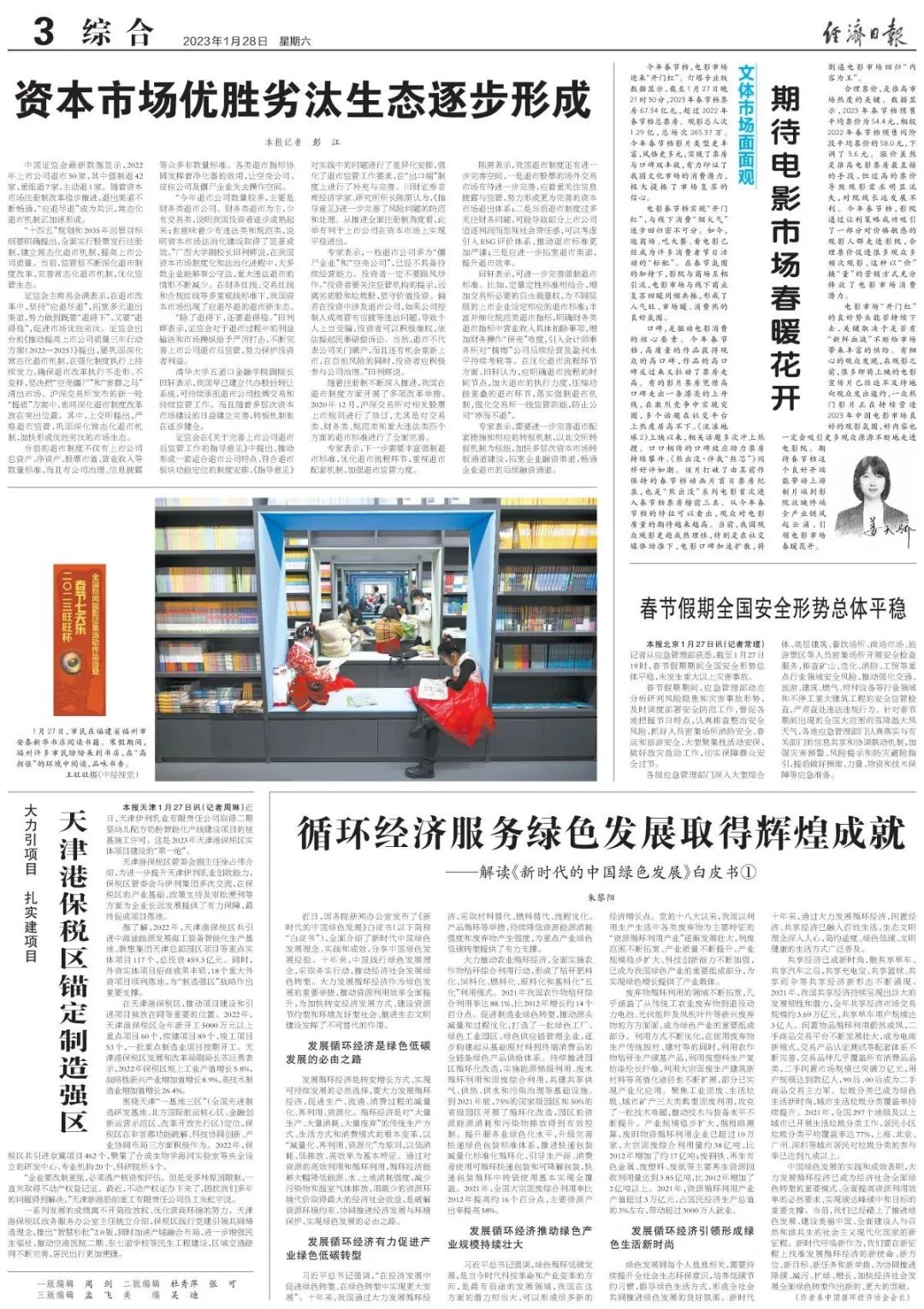循環(huán)經(jīng)濟(jì)服務(wù)綠色發(fā)展取得輝煌成就 ——解讀《新時(shí)代的中國(guó)綠色發(fā)展》白皮書(shū) 朱黎陽(yáng) 近日,國(guó)務(wù)院新聞辦公室發(fā)布了《新時(shí)代的中國(guó)綠色發(fā)展》白皮書(shū)(以下簡(jiǎn)稱(chēng)“白皮書(shū)”),全面介紹了新時(shí)代中國(guó)綠色發(fā)展理念、實(shí)踐和成效,分享中國(guó)綠色發(fā)展經(jīng)驗(yàn)。十年來(lái),中國(guó)踐行綠色發(fā)展理念,采取務(wù)實(shí)行動(dòng),推動(dòng)經(jīng)濟(jì)社會(huì)發(fā)展綠色轉(zhuǎn)型。大力發(fā)展循環(huán)經(jīng)濟(jì)作為綠色發(fā)展的重要舉措,推動(dòng)資源利用效率全面提升,為加快轉(zhuǎn)變經(jīng)濟(jì)發(fā)展方式、建設(shè)資源節(jié)約型和環(huán)境友好型社會(huì)、推進(jìn)生態(tài)文明建設(shè)發(fā)揮了不可替代的作用。 01 發(fā)展循環(huán)經(jīng)濟(jì)是綠色低碳發(fā)展的必由之路 發(fā)展循環(huán)經(jīng)濟(jì)是轉(zhuǎn)變?cè)鲩L(zhǎng)方式、實(shí)現(xiàn)可持續(xù)發(fā)展的必然選擇,要大力發(fā)展循環(huán)經(jīng)濟(jì),促進(jìn)生產(chǎn)、流通、消費(fèi)過(guò)程的減量化、再利用、資源化。循環(huán)經(jīng)濟(jì)是對(duì)“大量生產(chǎn)、大量消耗、大量廢棄”的傳統(tǒng)生產(chǎn)方式、生活方式和消費(fèi)模式的根本變革,以“減量化、再利用、資源化”為原則,以低消耗、低排放、高效率為基本特征。通過(guò)對(duì)資源的高效利用和循環(huán)利用,循環(huán)經(jīng)濟(jì)能夠大幅降低能源、水、土地消耗強(qiáng)度,減少污染物和溫室氣體排放,用最少的資源環(huán)境代價(jià)取得最大的經(jīng)濟(jì)社會(huì)效益,是破解資源環(huán)境約束、協(xié)同推進(jìn)經(jīng)濟(jì)發(fā)展與環(huán)境保護(hù)、實(shí)現(xiàn)綠色發(fā)展的必由之路。 02 發(fā)展循環(huán)經(jīng)濟(jì)有力促進(jìn)產(chǎn)業(yè)綠色低碳轉(zhuǎn)型 習(xí)近平總書(shū)記強(qiáng)調(diào),“在經(jīng)濟(jì)發(fā)展中促進(jìn)綠色轉(zhuǎn)型、在綠色轉(zhuǎn)型中實(shí)現(xiàn)更大發(fā)展”。十年來(lái),我國(guó)通過(guò)大力發(fā)展循環(huán)經(jīng)濟(jì),采取材料替代、燃料替代、流程優(yōu)化、產(chǎn)品循環(huán)等舉措,持續(xù)降低資源能源消耗強(qiáng)度和廢棄物產(chǎn)生強(qiáng)度,為重點(diǎn)產(chǎn)業(yè)綠色低碳轉(zhuǎn)型提供了有力支撐。 大力推動(dòng)農(nóng)業(yè)循環(huán)經(jīng)濟(jì),全面實(shí)施農(nóng)作物秸稈綜合利用行動(dòng),形成了秸稈肥料化、飼料化、燃料化、原料化和基料化“五化”利用模式。2021年我國(guó)農(nóng)作物秸稈綜合利用率達(dá)88.1%,比2012年增長(zhǎng)約14個(gè)百分點(diǎn)。促進(jìn)制造業(yè)綠色轉(zhuǎn)型,推動(dòng)源頭減量和過(guò)程優(yōu)化,打造了一批綠色工廠、綠色工業(yè)園區(qū)、綠色供應(yīng)鏈管理企業(yè),逐步構(gòu)建起從基礎(chǔ)原材料到終端消費(fèi)品的全鏈條綠色產(chǎn)品供給體系。持續(xù)推進(jìn)園區(qū)循環(huán)化改造,實(shí)施能源梯級(jí)利用、廢水循環(huán)利用和固廢綜合利用,共建共享供氣、供熱、供水和污染治理等基礎(chǔ)設(shè)施。到2021年底,75%的國(guó)家級(jí)園區(qū)和50%的省級(jí)園區(qū)開(kāi)展了循環(huán)化改造,園區(qū)的資源能源消耗和污染物排放得到有效控制。提升服務(wù)業(yè)綠色化水平,升級(jí)完善快遞綠色包裝標(biāo)準(zhǔn)體系,推進(jìn)快遞包裝減量化、標(biāo)準(zhǔn)化、循環(huán)化,引導(dǎo)生產(chǎn)商、消費(fèi)者使用可循環(huán)快遞包裝和可降解包裝,快遞包裝循環(huán)中轉(zhuǎn)袋使用基本實(shí)現(xiàn)全覆蓋。2021年,全國(guó)大宗固廢綜合利用率比2012年提高約16個(gè)百分點(diǎn),主要資源產(chǎn)出率提高58%。 03 發(fā)展循環(huán)經(jīng)濟(jì)推動(dòng)綠色產(chǎn)業(yè)規(guī)模持續(xù)壯大 習(xí)近平總書(shū)記強(qiáng)調(diào),綠色循環(huán)低碳發(fā)展,是當(dāng)今時(shí)代科技革命和產(chǎn)業(yè)變革的方向,是最有前途的發(fā)展領(lǐng)域,我國(guó)在這方面的潛力相當(dāng)大,可以形成很多新的經(jīng)濟(jì)增長(zhǎng)點(diǎn)。黨的十八大以來(lái),我國(guó)以利用生產(chǎn)生活中各類(lèi)廢棄物為主要特征的“資源循環(huán)利用產(chǎn)業(yè)”逐漸發(fā)展壯大,利廢范圍不斷拓寬、產(chǎn)業(yè)質(zhì)量不斷提升、產(chǎn)業(yè)規(guī)模穩(wěn)步擴(kuò)大、科技創(chuàng)新能力不斷加強(qiáng),已成為我國(guó)綠色產(chǎn)業(yè)的重要組成部分,為實(shí)現(xiàn)綠色增長(zhǎng)提供了產(chǎn)業(yè)載體。 廢棄物循環(huán)利用的領(lǐng)域不斷拓寬,幾乎涵蓋了從傳統(tǒng)工農(nóng)業(yè)廢棄物到退役動(dòng)力電池、光伏組件及風(fēng)機(jī)葉片等新興廢棄物的方方面面,成為綠色產(chǎn)業(yè)的重要組成部分。利用方式不斷優(yōu)化,在使用廢棄物生產(chǎn)傳統(tǒng)板材、建材等的同時(shí),利用農(nóng)作物秸稈生產(chǎn)碳基產(chǎn)品,利用廢塑料生產(chǎn)復(fù)紡滌綸長(zhǎng)纖維,利用大宗固廢生產(chǎn)建筑新材料等高值化途徑也不斷擴(kuò)展,部分已實(shí)現(xiàn)產(chǎn)業(yè)化應(yīng)