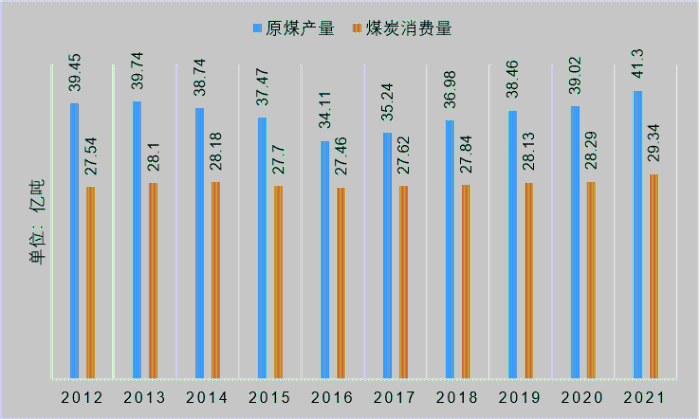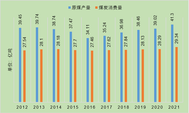 我國經濟快速發展是以大量的能源消費為代價的,以煤為主的能源生產和消費結構短期內難以根本改變,需要立足國情,穩步轉型。我國現已成為世界最大的鋼鐵、建材、電解鋁、化工等大宗原料及材料的生產國和供應國,世界最大煤炭消耗國、第二石油消耗國。2021年,全國原煤產量41.3億噸、煤炭消費量29.34億噸,分別比上年增長5.7%、4.6%(圖2)。過去十年,盡管煤炭消費量占能源消費總量的比重下降了12.5個百分點,但仍然高達56%。煤電裝機容量11.1億千瓦,占總裝機容量的46.7%;以燃煤發電為主的火力發電量5.77萬億千瓦時,占全國總發電量的71.1%。我國還是油氣進口大國,油氣對外依存度長期居高不下。2021年,我國原油和天然氣進口量分別為5.13億噸、1675億立方米,對外依存度分別為72%、44.9%。在較長一段時期內,煤炭仍將是生產消費的主體能源,火電仍將在電力結構中占主導地位,化石能源向非化石能源的結構轉型不可能一蹴而就。
