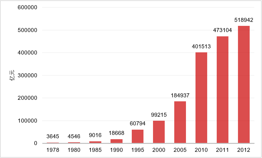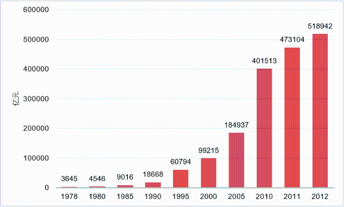 1979-2012年,我國國內生產總值高速增長,年均增長9.8%,同期世界經濟年均增速只有2.8%。國內生產總值由1978年的3645億元急速躍升至2012年的約52萬億元(圖1)。經濟總量占世界的份額由1978年的1.8%提高到2012年的11.5%,成為僅次于美國的世界第二大經濟體。城鎮化水平由1978年的17.9%上升到2012年的52.6%,城鎮總人口年均增加1586萬人。工業生產能力迅速提高,主要工業產品產量迅猛增長。2012年,原煤產量達到36.5億噸,比1978年增長4.9倍;粗鋼7.2億噸,增長21.8倍;水泥22.1億噸,增長32.9倍;汽車1928萬輛,增長128.3倍。我國能源消費總量年均增長5.6%。