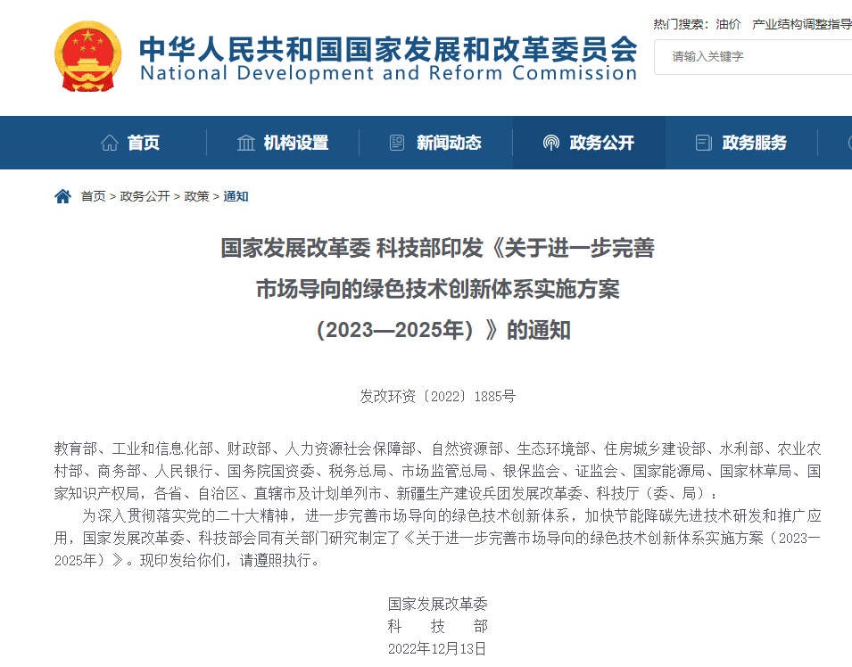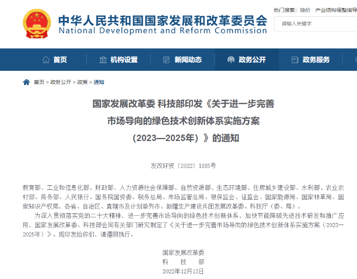 “十四五”時期,我國生態文明建設進入以降碳為重點戰略方向、推動減污降碳協同增效、促進經濟社會發展全面綠色轉型、實現生態環境質量改善由量變到質變的關鍵時期,綠色技術創新對綠色低碳發展的關鍵支撐作用愈加凸顯。為進一步完善市場導向的綠色技術創新體系,持續強化綠色技術創新對綠色低碳發展的支撐作用,國家發展改革委、科技部聯合印發了《關于進一步完善市場導向的綠色技術創新體系實施方案(2023—2025年)》(發改環資〔2022〕1885號),對未來三年完善市場導向的綠色技術創新體系工作進行了系統部署,為加快發展方式綠色低碳轉型、推動高質量發展提供有力科技支撐。