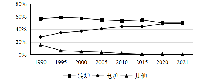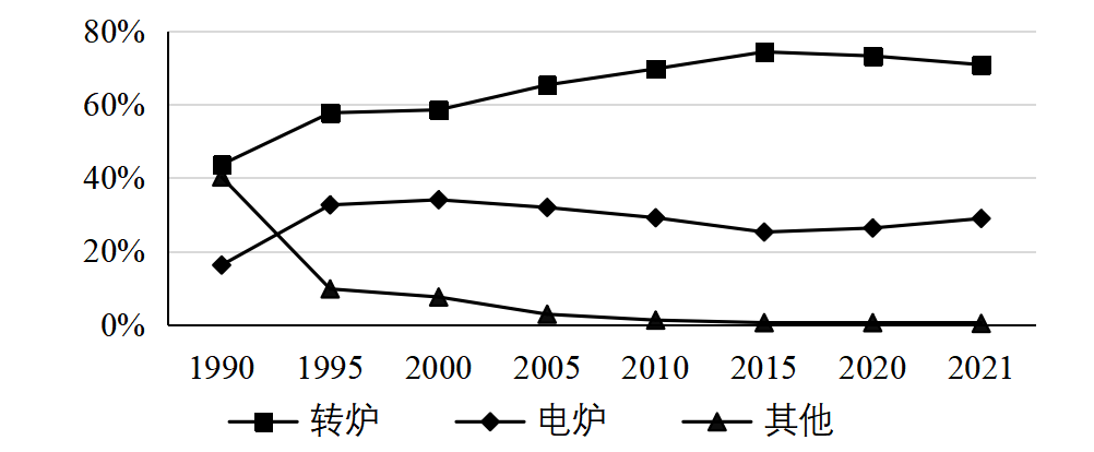 圖1 1990年以來全球粗鋼生產工藝結構