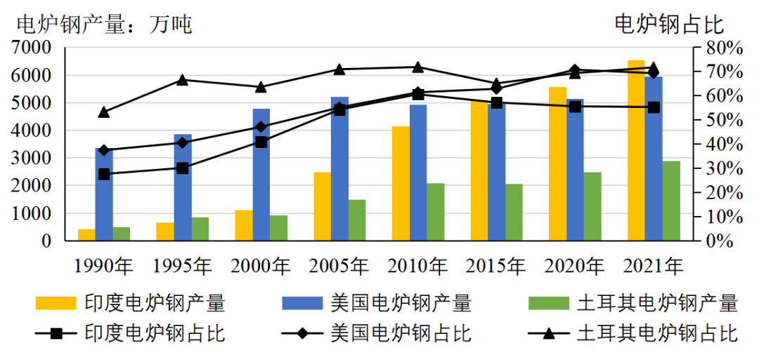 印度、美國、土耳其等國依托自身資源條件,逐步形成了以電爐鋼為主的工藝結構(見圖5)。1990年-2021年,印度電爐鋼產量從411萬噸增長到6525萬噸,增加6084萬噸,增長14.9倍;美國電爐鋼產量從3351萬噸增長到5937萬噸,增加2586萬噸,增幅77.2%;土耳其電爐鋼產量從496萬噸增長到2893萬噸,增加2397萬噸,增長4.8倍。2021年,印度、美國、土耳其電爐鋼占比分別為55.2%、69.2%、71.6%。