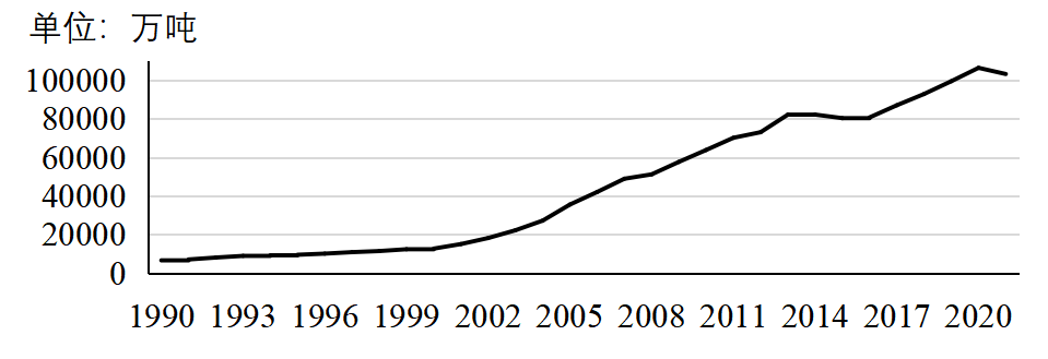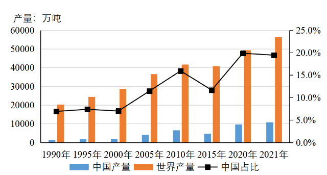 1990年-2021年,我國粗鋼產量快速增長(見圖7),從6635萬噸增至10.33億噸,增加14.6倍;占全球粗鋼產量的比重從8.9%增至53.0%。特別是2000-2013年粗鋼產量從1.27億噸增至8.22億噸,2016-2020年粗鋼產量從8.08億噸增至10.65億噸,年均增量均在5000萬噸以上。