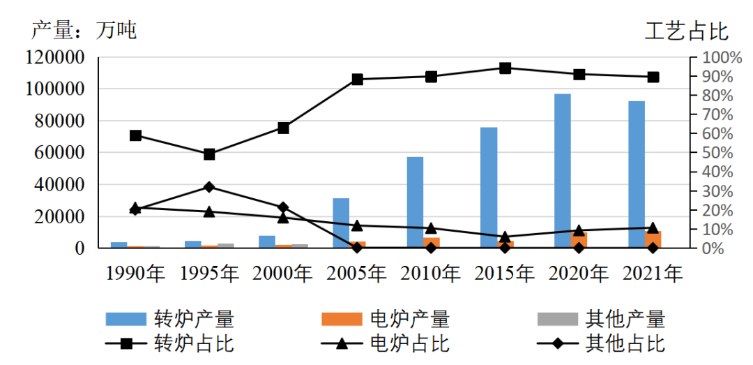 2.我國粗鋼生產以轉爐工藝為主,2000年以后平爐工藝逐漸被淘汰