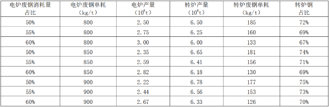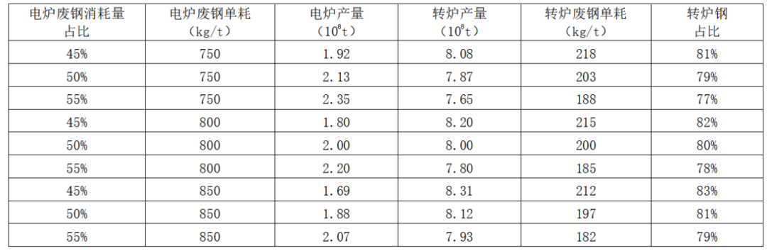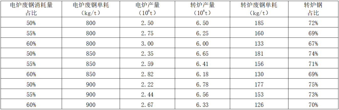 若按照粗鋼產量10億噸、廢鋼利用量3.2億噸,電爐廢鋼消耗量占比分別提升至45%、50%、55%,電爐廢鋼單耗分別提升至750千克/噸、800千克/噸、850千克/噸測算,不同條件下轉爐鋼占比基本保持在80%左右,見表1。