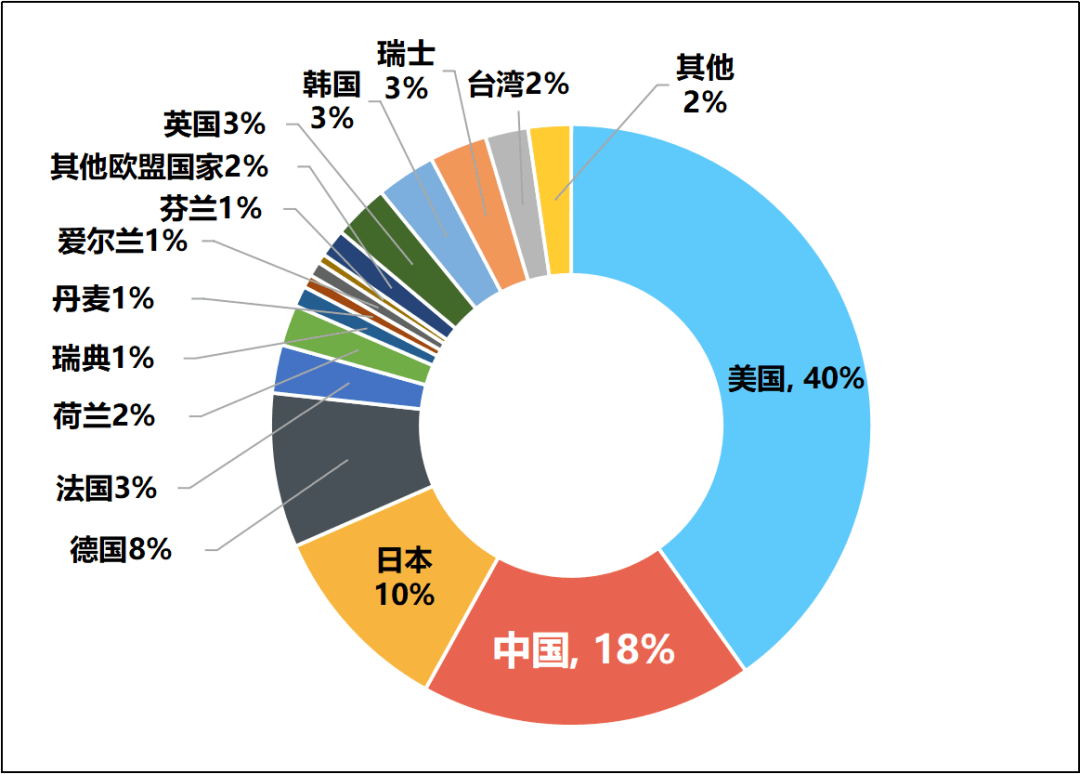 通過對2022年全球主要國家和地區企業研發投入占比分析可以看出,美國最高,約為40%,我國約為18%,研發投入方面存在一定差距。