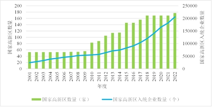 高新技術產業開發區(簡稱高新區)與經濟技術開發區(簡稱經開區)、科技園、工業區等共同構成了我國產業園區的主要形態,是我國實施創新驅動發展戰略和推動經濟轉型發展的重要載體,特別是國家高新區的發展,以“發展高科技、實現產業化”為指導方向,圍繞產業鏈部署創新鏈,圍繞創新鏈布局產業鏈,成為創新驅動發展示范區和高質量發展先行區,現已進入“三次創業”全面創新階段。目前,關于國家高新區發展戰略和發展路徑的研究,主要聚焦創新驅動、綠色發展、政策支持、體制機制等方面進行了豐富的探索,為國家高新區加快發展提供了有效的借鑒[1-2]。同時,隨著30多年的大規模發展,我國高新區進入“做高位勢、做強存量、整合資源”的新發展階段,新晉國家高新區也將主要從省級及以下高新區升級而來,即“以升促建”,根據科技部印發的《“十四五”國家高新技術產業開發區發展規劃》,“十四五”末國家高新區數量達到220家左右,將實現東部大部分地級市和中西部重要地級市基本覆蓋,挖掘現有高新區發展潛力,整合國家高新區資源打造國家自創區將成為主要發展趨勢[3]