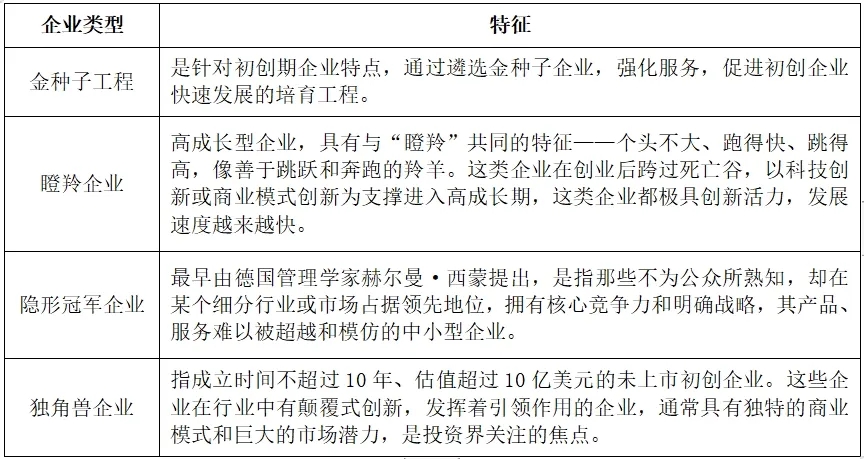 在2020前后,北京市經開區曾提出一套頗為形象的創新企業發展路徑,即打造“金種子—展翼—瞪羚—專精特新—小巨人—隱形冠軍—獨角獸”創新企業梯隊,形成具有經開區特色的創新“雁陣”體系(見表1)。