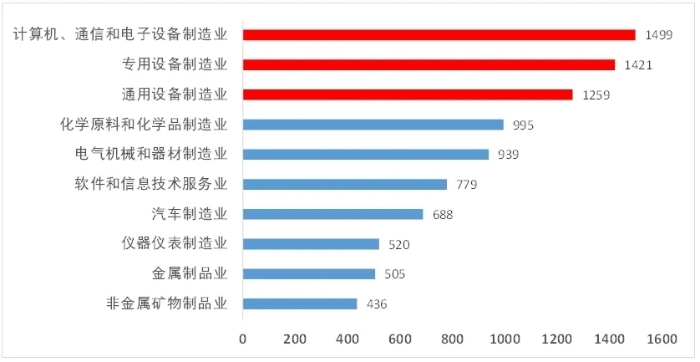 從行業來看[2],專精特新“小巨人”企業集中在制造業、科技創新以及人工智能等領域。專精特新“小巨人”企業分布前10行業分別是計算機、通信和電子設備制造業、專用設備制造業、通用設備制造業、化學原料和化學品制造、電氣機械和器材制造業、軟件和信息技術服務業、汽車制造業、儀器儀表制造業、金屬制品業、非金屬礦物制品業(見圖2)。