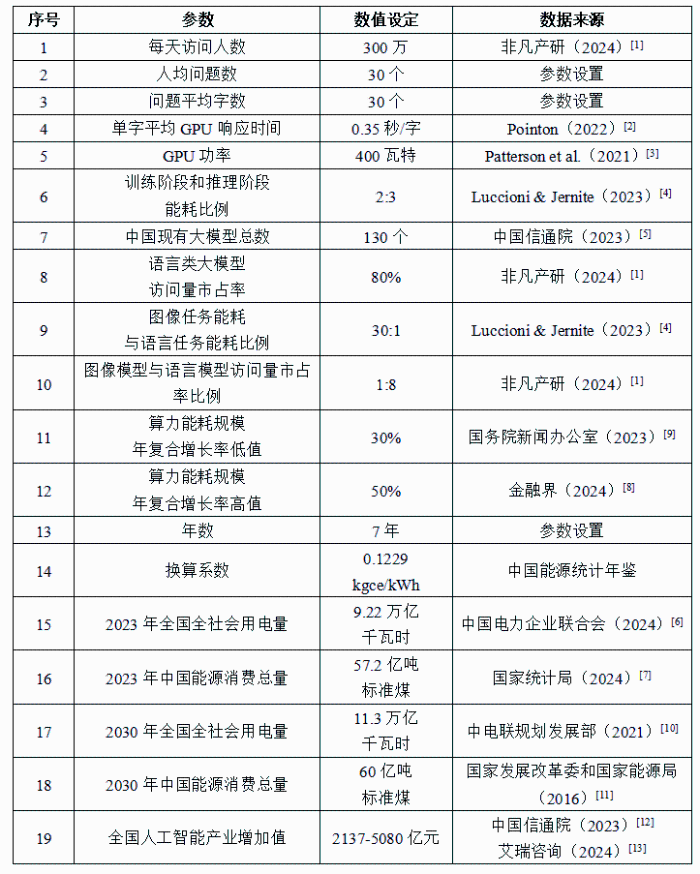 (二)數(shù)據(jù)來源 計算過程的參數(shù)設(shè)置與數(shù)據(jù)來源如下表所示。在人工智能大模型能耗現(xiàn)狀計算方面,主要參數(shù)包括每天訪問人數(shù)、人均問題數(shù)、問題平均字數(shù)等。其中,每天訪問人數(shù)、語言類大模型訪問量市占率、圖像模型與語言模型訪問量市占率比例均來自非凡產(chǎn)研[1]的2024年度報告。單字平均GPU響應(yīng)時間數(shù)值來自Pointon(2022)[2],即0.35秒/字。根據(jù)Patterson等人[3]的研究結(jié)果,GPU功率為400瓦特。基于Luccioni & Jernite(2023)[4],語言類大模型訓(xùn)練和推斷階段的能耗比例為2:3,圖像任務(wù)能耗與語言任務(wù)能耗比例為30:1。中國現(xiàn)有大模型總數(shù)來自中國信通院(2023)[5]。在計算2023年人工智能電耗與能耗占全國電耗與能耗比重時,所使用的2023年全國全社會用電量數(shù)據(jù)來源于中國電力企業(yè)聯(lián)合會(2024)[6],2023年中國能源消費總量數(shù)據(jù)來源于國家統(tǒng)計局發(fā)布的年度報告[7]。此外,人均問題數(shù)與問題平均字數(shù)均基于行業(yè)常規(guī)均設(shè)置為30個。 在人工智能大模型能耗預(yù)測計算方面,主要參數(shù)包括算力能耗規(guī)模年復(fù)合增長率、增長年數(shù)等。其中預(yù)測增長年數(shù)設(shè)定為7年。算力能耗規(guī)模年復(fù)合增長率的高低值數(shù)據(jù)分別參考金融界于2024年[8]發(fā)布的研究報告與國務(wù)院新聞辦公室在2023年[9]的公開數(shù)據(jù)。在計算2030年人工智能電耗及能耗占全國比重時,所使用的2030年全國全社會用電量和能耗預(yù)測值分別來源于中電聯(lián)規(guī)劃發(fā)展部(2021)[10]和國家發(fā)展改革委&國家能源局(2016)[11]。此外,全國人工智能產(chǎn)業(yè)增加值數(shù)據(jù)來自于中國信通院(2023)[12]和艾瑞咨詢(2024)[13]。 表1 參數(shù)設(shè)置及數(shù)據(jù)來源