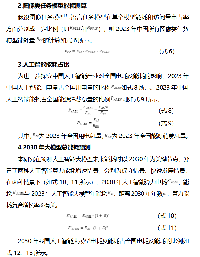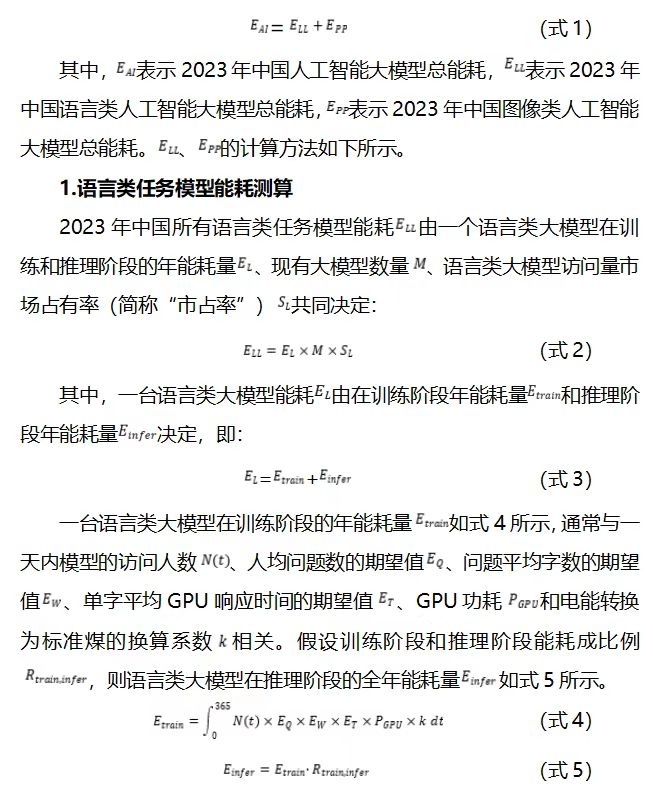 摘要:人工智能大模型技術(shù)引領(lǐng)的新興產(chǎn)業(yè)發(fā)展正成為全球新一輪科技革命和產(chǎn)業(yè)競爭的新高地、新賽道。我國牢牢把握這一戰(zhàn)略機遇,推動新一代人工智能模型成為新質(zhì)生產(chǎn)力的典型代表,實現(xiàn)全產(chǎn)業(yè)高質(zhì)量發(fā)展。然而,人工智能模型性能發(fā)展所依托的模型參數(shù)擴張、訓(xùn)練次數(shù)升級以及伴隨著的使用頻率躍增,已然導(dǎo)致算力需求和能源消費過快增長。在當前嚴峻的節(jié)能形勢背景下,人工智能的能耗問題與節(jié)能工作之間的潛在矛盾備受關(guān)注。鑒于此,本文對人工智能的能耗影響及挑戰(zhàn)進行了測算分析,認為人工智能產(chǎn)業(yè)能耗的長期影響總體可控,但短期局部影響仍然突出,或與節(jié)能工作形成沖突,建議從強化產(chǎn)業(yè)發(fā)展要素保障、摸排產(chǎn)業(yè)發(fā)展情況、建立綠色低碳管理機制、深化“東數(shù)西算”格局四個方面,推動人工智能產(chǎn)業(yè)綠色低碳發(fā)展。 一、研究背景 以大模型為代表的人工智能技術(shù)和產(chǎn)業(yè)已成為當今經(jīng)濟社會發(fā)展的重要支撐,發(fā)展新一代人工智能大模型是加快形成新質(zhì)生產(chǎn)力、培育經(jīng)濟發(fā)展新動能、贏得全球科技競爭主動權(quán)的戰(zhàn)略抓手。自2020年起,人工智能由傳統(tǒng)的“判別式小模型”轉(zhuǎn)向更為先進的“生成式大模型”,代表性功能也從人臉識別、目標檢測、文本分類升級到如今的文本生成、圖像生成、語音生成、視頻生成等。 人工智能大模型計算系統(tǒng)通常由深度神經(jīng)網(wǎng)絡(luò)構(gòu)建而成,具有萬億量級參數(shù)規(guī)模和復(fù)雜計算結(jié)構(gòu),能夠根據(jù)已學(xué)習的內(nèi)容進行基礎(chǔ)性地判斷以及創(chuàng)造性地生成新內(nèi)容。其中,語言類和圖像類任務(wù)大模型應(yīng)用場景較為廣泛,正成為當前人工智能技術(shù)研究和應(yīng)用的熱點方向。具體而言,語言類任務(wù)大模型主要用于理解和生成自然語言文本,處理諸如文本分類、問答系統(tǒng)、文字生成等文字任務(wù),代表性模型有OpenAI公司發(fā)布的ChatGPT、百度公司發(fā)布的文心一言等。圖像類任務(wù)大模型則主要用于處理和理解圖像內(nèi)容,執(zhí)行諸如圖像分類、目標檢測、圖像生成等視覺任務(wù),代表性模型包括OpenAI公司的DALL-E、智譜人工智能研究院的CogVLM等。 隨著人工智能技術(shù)的快速發(fā)展,其背后的算力支撐和電力供應(yīng)變得愈發(fā)關(guān)鍵。算力,即單位時間內(nèi)處理數(shù)據(jù)或信息的能力(FLOPS),主要以計算機設(shè)備、數(shù)據(jù)中心、智算中心等算力基礎(chǔ)設(shè)施作為運行載體,而電力則為其提供必要的能源支撐,以確保算力的穩(wěn)定高效運行。由于人工智能技術(shù)的快速發(fā)展高度依賴于模型參數(shù)規(guī)模擴大、訓(xùn)練次數(shù)升級以及伴隨著的使用頻率躍增,算力需求和能源消耗呈現(xiàn)快速增長態(tài)勢,也由此引發(fā)了一系列關(guān)注。然而已有研究多聚焦于能耗總量分析,鮮有深入探討其時空分布特點以及結(jié)合節(jié)能工作形勢全面分析能耗挑戰(zhàn)。為此,本文以語言類和圖像類大模型兩類人工智能大模型為代表對人工智能能耗進行了測算,并結(jié)合時空分布以及節(jié)能工作形勢分析了人工智能能耗帶來的挑戰(zhàn),最后從要素保障、產(chǎn)業(yè)摸底、管理機制、戰(zhàn)略格局等維度提出了政策建議,以期為我國人工智能產(chǎn)業(yè)綠色低碳發(fā)展提供有力支撐。 二、研究方法與數(shù)據(jù) 本研究基于人工智能領(lǐng)域相關(guān)政策文件、研究報告、學(xué)術(shù)文獻等最新信息,構(gòu)建了以語言類大模型和圖像類大模型能耗情況為代表的人工智能大模型能耗計算方法,并對我國人工智能發(fā)展的能耗影響進行了測算分析。 (一)大模型總能耗現(xiàn)狀測算 當前中國人工智能大模型總能耗主要由語言類大模型總能耗和圖像類大模型總能耗構(gòu)成(受限于數(shù)據(jù)可得性,以2023年大模型發(fā)展情況對其能耗水平現(xiàn)狀進行測算),如式1所示: