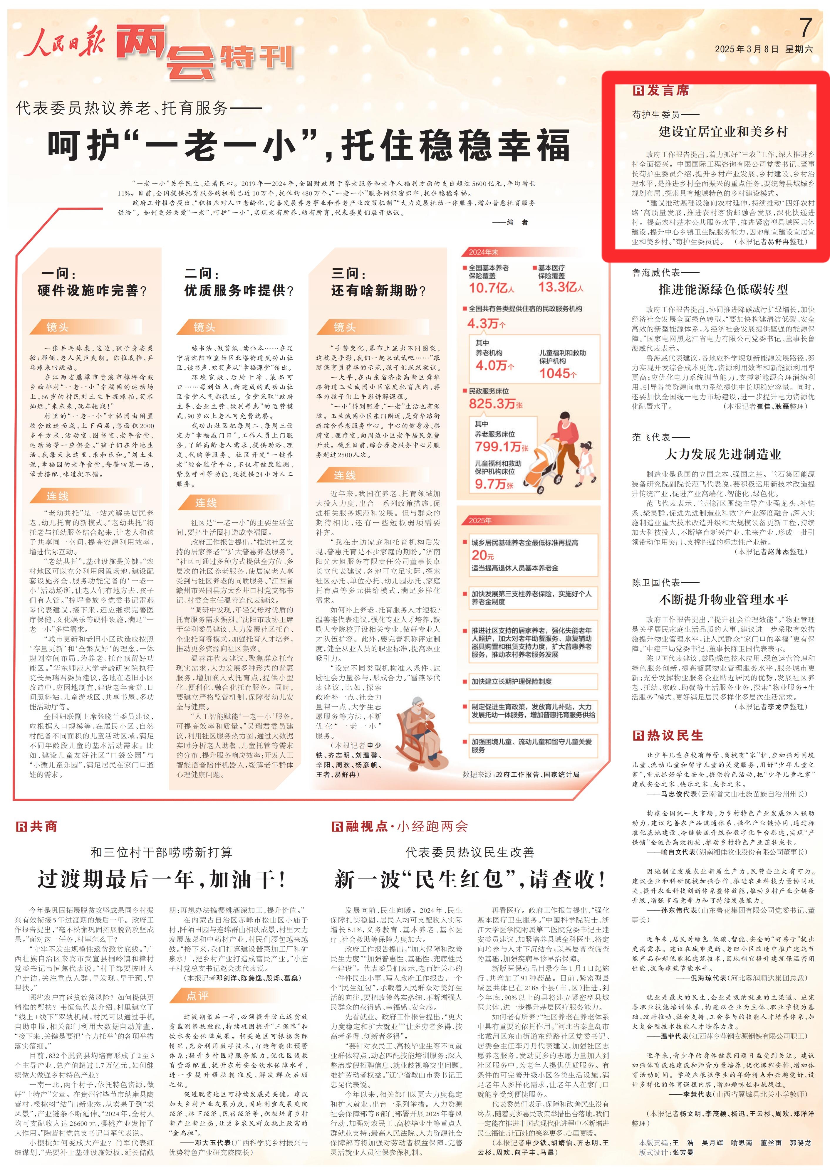 茍護生委員—— 建設宜居宜業(yè)和美鄉(xiāng)村 政府工作報告提出,著力抓好“三農(nóng)”工作,深入推進鄉(xiāng)村全面振興。中國國際工程咨詢有限公司黨委書記、董事長茍護生委員介紹,提升鄉(xiāng)村產(chǎn)業(yè)發(fā)展、鄉(xiāng)村建設、鄉(xiāng)村治理水平,是推進鄉(xiāng)村全面振興的重點任務,要統(tǒng)籌縣域城鄉(xiāng)規(guī)劃布局,探索具有地域特色的鄉(xiāng)村建設模式。 “建議推動基礎設施向農(nóng)村延伸,持續(xù)推動‘四好農(nóng)村路’高質(zhì)量發(fā)展,推進農(nóng)村客貨郵融合發(fā)展,深化快遞進村。提高農(nóng)村基本公共服務水平,推進緊密型縣域醫(yī)共體建設,提升中心鄉(xiāng)鎮(zhèn)衛(wèi)生院服務能力,因地制宜建設宜居宜業(yè)和美鄉(xiāng)村。”茍護生委員說。 (本報記者易舒冉整理) 魯海威代表—— 推進能源綠色低碳轉型 政府工作報告提出,協(xié)同推進降碳減污擴綠增長,加快經(jīng)濟社會發(fā)展全面綠色轉型。“要加快構建清潔低碳、安全高效的新型能源體系,為經(jīng)濟社會發(fā)展提供堅強的能源保障。”國家電網(wǎng)黑龍江省電力有限公司黨委書記、董事長魯海威代表表示。 魯海威代表建議,各地應科學規(guī)劃新能源發(fā)展路徑,努力實現(xiàn)開發(fā)綜合成本更優(yōu),資源利用效率和新能源利用率更高;應優(yōu)化電力系統(tǒng)調(diào)節(jié)能力,支撐新能源合理消納利用,引導各類資源向電力系統(tǒng)提供中長期穩(wěn)定容量。同時,還要加快全國統(tǒng)一電力市場建設,進一步提升電力資源優(yōu)化配置水平。 (本報記者崔佳、耿磊整理) 范飛代表—— 大力發(fā)展先進制造業(yè) 制造業(yè)是我國的立國之本、強國之基。蘭石集團能源裝備研究院副院長范飛代表說,要積極運用新技術改造提升傳統(tǒng)產(chǎn)業(yè),促進產(chǎn)業(yè)高端化、智能化、綠色化。 范飛代表表示,蘭州新區(qū)圍繞主導產(chǎn)業(yè)強龍頭、補鏈條、聚集群,促進先進制造業(yè)和數(shù)字產(chǎn)業(yè)深度融合;深入實施制造業(yè)重大技術改造升級和大規(guī)模設備更新工程,持續(xù)加大科技投入,不斷培育新興產(chǎn)業(yè)、未來產(chǎn)業(yè),形成一批引領帶動作用突出、支撐性強的標志性產(chǎn)業(yè)鏈。 (本報記者趙帥杰整理) 陳衛(wèi)國代表—— 不斷提升物業(yè)管理水平 政府工作報告提出,“提升社會治理效能”。“物業(yè)管理是關乎居民家庭生活品質(zhì)的大事,建議進一步采取有效措施提升物業(yè)管理水平,讓人民群眾‘家門口的幸福’更有保障。”中建三局黨委書記、董事長陳衛(wèi)國代表表示。 陳衛(wèi)國代表建議,鼓勵綠色技術應用、綠色運營管理和綠色服務創(chuàng)新,提高智慧物業(yè)管理服務水平,服務城市更新;充分發(fā)揮物業(yè)服務企業(yè)貼近居民的優(yōu)勢,發(fā)展社區(qū)養(yǎng)老、托幼、家政、助餐等生活服務業(yè)務,探索“物業(yè)服務+生活服務”模式,更好滿足居民多樣化多層次生活需求。 (本報記者李龍伊整理) | |||||