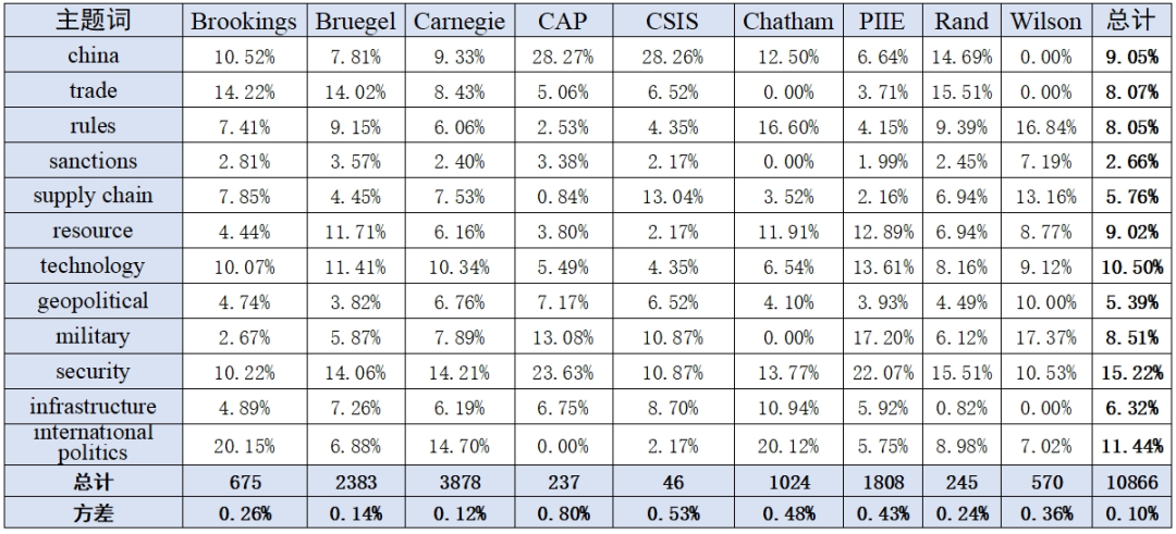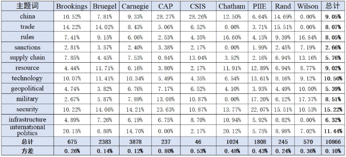 2024年美歐高端智庫報告分析(上篇) ——基于10866篇報告的大數(shù)據(jù)分析 王一童 柴亞超 童天樂 一、研究背景 2024年上半年,全球政治經(jīng)濟局勢總體穩(wěn)定。各地區(qū)經(jīng)濟穩(wěn)步復蘇,制造業(yè)景氣度提高,通脹水平下降,貿(mào)易明顯回升,新技術(shù)的引入推動世界經(jīng)濟和社會的深刻變革。當前形勢下,及時準確把握、分析和研判美國、歐洲等發(fā)達地區(qū)國家政治動向和社會輿論,具有重要意義。美歐智庫發(fā)展歷史悠久,關(guān)注領(lǐng)域廣泛,在研究成果數(shù)量和影響力方面處于世界領(lǐng)先地位,其發(fā)布的觀點、分析和評論也成為了當下了解美歐國家政府內(nèi)部認知和社會公共輿論的一扇重要窗口。 2022年以來,中咨公司持續(xù)跟蹤美歐智庫研究動向,對美歐智庫全量報告文本進行大數(shù)據(jù)分析,本報告屬于美歐智庫成果大數(shù)據(jù)研究系列。希望能使相關(guān)部門更全面了解美歐國家對國際政治、經(jīng)濟貿(mào)易、中國發(fā)展等關(guān)鍵領(lǐng)域的認知情況,以助力我國政府決策部門及時判斷和預測美歐國家對我國的政策戰(zhàn)略計劃,結(jié)合國內(nèi)實際情況制定應對策略,提升我國信息情報領(lǐng)域的決策參考服務水平,在國際社會中更好地樹立和提升中國話語權(quán)。 二、樣本選取 研究樣本選取美國布魯金斯學會(Brookings)、美國卡內(nèi)基國際和平基金會(Carnegie)、比利時布魯蓋爾研究所(Bruegel)、美國戰(zhàn)略與國際問題研究中心(CSIS)、英國皇家國際事務研究所(Chatham)、美國蘭德公司(Rand)、美國彼得森國際經(jīng)濟研究所(PIIE)、威爾遜中心(Wilson)和美國進步中心(CAP)等9家智庫。 樣本報告涵蓋中國、產(chǎn)業(yè)鏈、芯片、氣候、債務、脫鉤、礦物、資源、俄羅斯、半導體、臺灣、技術(shù)等相關(guān)領(lǐng)域的研究報告,共計10866篇。 三、文本數(shù)據(jù)分析 (一)各智庫關(guān)注領(lǐng)域 2024年上半年,各歐美智庫與安全、科技、國際政治等主題相關(guān)的報告占比在五分之二左右,與中國、資源、制裁等主題相關(guān)的報告占比在五分之一左右,與貿(mào)易、規(guī)則、軍事、地緣政治等主題相關(guān)的報告約占五分之一,與基礎(chǔ)設(shè)施建設(shè)、供應鏈等主題相關(guān)的報告約占五分之一。不同主題下智庫關(guān)注的重點領(lǐng)域分析參見附件1。 1.威爾遜中心:國際政治和規(guī)則 威爾遜中心注重國際政治問題和規(guī)則方面的研究。根據(jù)威爾遜中心的分析,目前在國際政治的深層次問題上,俄羅斯和中國都對現(xiàn)有規(guī)則不滿意,試圖通過改變現(xiàn)有的國際規(guī)則來實現(xiàn)自己的利益,以建立一個更符合他們利益的多極國際體系。例如,中俄兩國通過團結(jié)第三世界國家來對布雷頓森林機構(gòu)進行改革,包括重新分配國際貨幣基金組織的配額,以使投票權(quán)與每個國家相對經(jīng)濟實力成正比。以巴西為代表的發(fā)展中國家也表示,當前國際金融機構(gòu)的改革不足,將推動發(fā)展中國家轉(zhuǎn)向中國發(fā)起的具有重要影響力的機構(gòu),如亞洲基礎(chǔ)設(shè)施投資銀行等。威爾遜中心認為,在國際規(guī)則塑造的研究中,穩(wěn)定的世界秩序平衡需要依賴獲得全球共同認可的規(guī)范、規(guī)則和法律的建立。美國為代表的西方國家明確宣布在印太地區(qū)建立致力于維護符合自身發(fā)展的國際秩序,并通過排斥敵對國家來進行維護合作伙伴關(guān)系和實現(xiàn)共同的愿景。然而,中俄兩國的影響力和中國的共建“一帶一路”倡議使得西方塑造的國際規(guī)范逐漸黯然失色,這將會使得全球進入多方博弈的復雜局面。 2.布魯金斯學會:安全和貿(mào)易 布魯金斯學會的研究領(lǐng)域較為廣泛,其研究相對側(cè)重國家安全和貿(mào)易方面。布魯金斯學會認為過去幾十年,傳統(tǒng)產(chǎn)業(yè)政策在國際層面很大程度上不再流行,但供應鏈和國家安全問題推動了大型經(jīng)濟體迅速實施新型產(chǎn)業(yè)政策,包括關(guān)稅、補貼和稅收優(yōu)惠等有針對性的干預措施,這些措施旨在加強特定行業(yè)(供應鏈)的安全性,包括汽車、醫(yī)療設(shè)備和信息技術(shù)(IT)等供應鏈。由于美國與中國的地緣政治競爭加劇,使得美國與盟友達成相關(guān)貿(mào)易協(xié)議變得重要,“為了與中國競爭,美國應該擺出真正的貿(mào)易協(xié)議讓盟友受益?!辈剪斀鹚箤W會通過對全球貿(mào)易問題的大量分析,提出“全球貿(mào)易的發(fā)展對經(jīng)濟增長和國際合作至關(guān)重要”的觀點。貿(mào)易自由化和全球化促進了經(jīng)濟增長、創(chuàng)造了就業(yè)機會,并為解決全球挑戰(zhàn)和沖突提供了和平的合作途徑。然而貿(mào)易也面臨著諸如貿(mào)易平衡、保護主義和環(huán)境問題等挑戰(zhàn),政策制定者需要確保貿(mào)易的可持續(xù)發(fā)展和公平性。當前,中俄兩國和全球南方國家的經(jīng)濟貿(mào)易,尤其是能源貿(mào)易一直保持強勁,顯示了全球很大一部分地區(qū)對國際制裁的普遍不支持。而美國在天然氣領(lǐng)域控制歐洲市場后,通過投入資金迭代自身頁巖氣開采技術(shù),待成本下降后才能逐步解除對俄羅斯等國的能源制裁。 3.布魯蓋爾研究所:國際政治和貿(mào)易 布魯蓋
